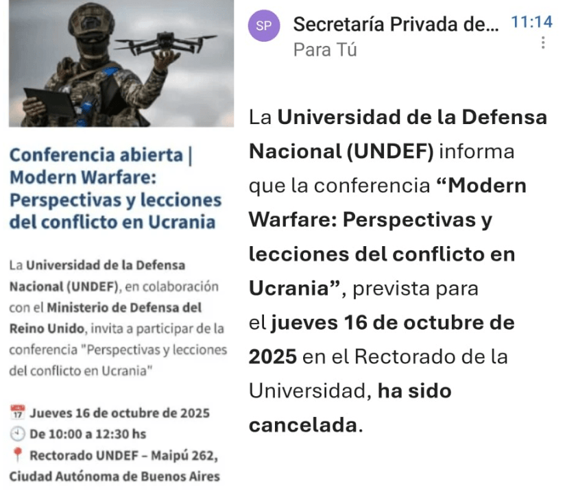 - Como si esto fuera poco, el Ministerio de Defensa y sus asesores militares, no satisfechos con este nivel de condescendencia, han ofrecido algo más “para la cartera de la dama y el bolsillo del caballero”. Se trata de actividades que estaban planificadas para los días 14 de octubre (en la embajada británica) y 16 de octubre (en la Universidad de la Defensa Nacional), relativas a la temática “Modern Warfare: Perspectivas y lecciones del conflicto en Ucrania”. A ellas estaba previsto que concurriesen funcionarios políticos y militares por instrucción del ministro Luis Petri y del jefe del Estado Mayor Conjunto de las Fuerzas Armadas, brigadier general Xavier Isaac. Sorprendente: en la embajada de una potencia ocupante de nuestro territorio, y en la misma universidad en la que no se estudia el informe Rattenbach sobre las lecciones del conflicto del Atlántico Sur, autoridades políticas y uniformados argentinos preveían internalizar las enseñanzas para la OTAN de la guerra ruso-ucraniana. Finalmente, y producto del escándalo que generó, la conferencia pública en la UNDEF fue cancelada. Al cierre de esta nota, las fuentes consultadas no sabían qué ocurriría con la actividad cerrada a desarrollarse en la embajada británica.