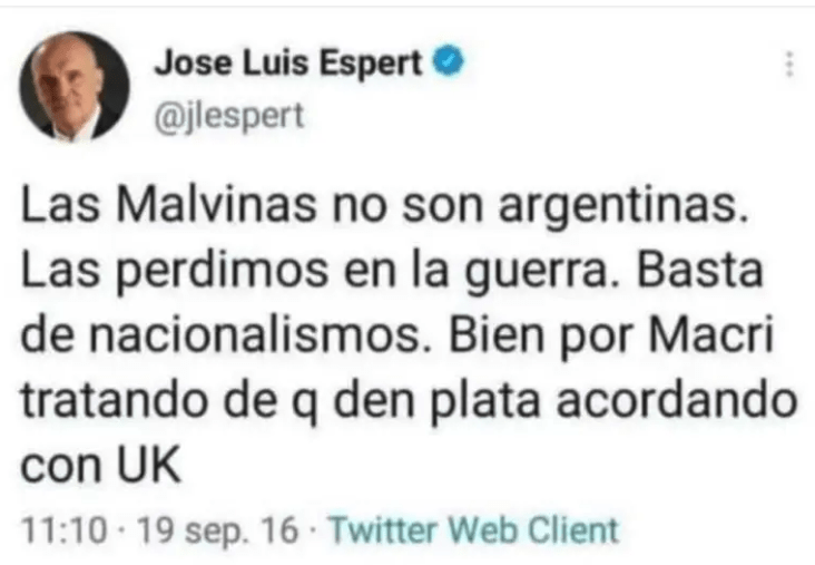 - A lo enumerado, se suman las tristemente célebres expresiones de los candidatos –los que están en carrera y los caídos en el intento– de La Libertad Avanza en dos de los principales distritos electorales del país. La ministra de Seguridad Nacional y candidata a senadora por la ciudad de Buenos Aires, Patricia Bullrich, afirmó, en plena pandemia por el Covid-19, que sería capaz de entregar las Malvinas a cambio de que la compañía farmacéutica Pfizer desembarcara con vacunas en el país. Por su parte, el frustrado primer candidato a diputado nacional por la Provincia de Buenos Aires, el “narconsultor” José Luis Espert, afirmó en 2019: “Las Malvinas no son argentinas. Las perdimos en la guerra. Basta de nacionalismos”.