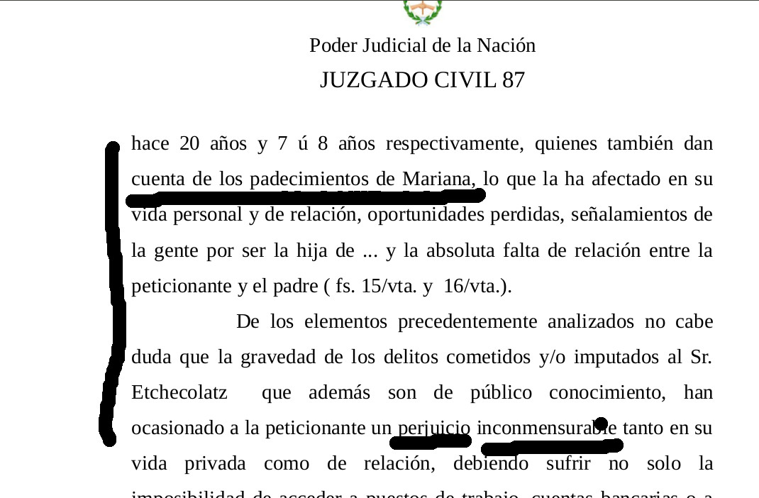 Yo soy Mariana Dopazo, la ex hija de Miguel Etchecolatz, que por decisión y elaboración propia después de un proceso de más de 40 años me habilité a mí misma a solicitar la supresión del apellido paterno y la sustitución por el apellido materno. Esa última decisión —porque fue la última, después de un proceso muy largo—, implicó apelar a la ley en el sentido de solicitar no tener que cargar más con ese apellido teñido de horror, de dolor, de vergüenza y de deshonra. En ese sentido, apelar a la ley como último eslabón tenía que ver con no permitirle ser mi padre nunca más.