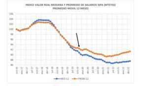 El fundamento de este reclamo es la necesidad de recuperar el poder adquisitivo de fines de 2018 para los salarios más bajos y se basa en la comparación entre el promedio de los salarios privados registrados y su mediana. La mediana es el valor que deja por debajo a la mitad de los trabajadores, o sea el techo de sus remuneraciones. Desde hace cuatro años, la mediana crece menos que el promedio, lo cual refleja la menor capacidad de negociación de los salarios más bajos dentro del sector privado, en el contexto de alta inflación. Pero, además, tanto la mediana como el promedio del salario real siguen por debajo de los valores del último mes de Macrì.