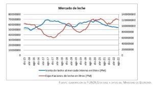 - Como puede observarse en el gráfico, el mercado de leche tiene tendencias similares al mercado cárnico: tendencia creciente de las exportaciones y decreciente de consumo interno.
