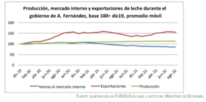 - Entre diciembre de 2019 y agosto de 2022 las ventas de leche al mercado interno se redujeron en un 14,4 %, mientas que las exportaciones crecieron un 54,4 %.
