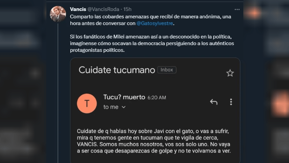 Roda apoyó la denuncia de la líder de Generación Liberal y al anticipar que hablaría en un programa de radio para defender su postura recibió amenazas anónimas, que vinculó a seguidores de Milei y expuso en sus redes.