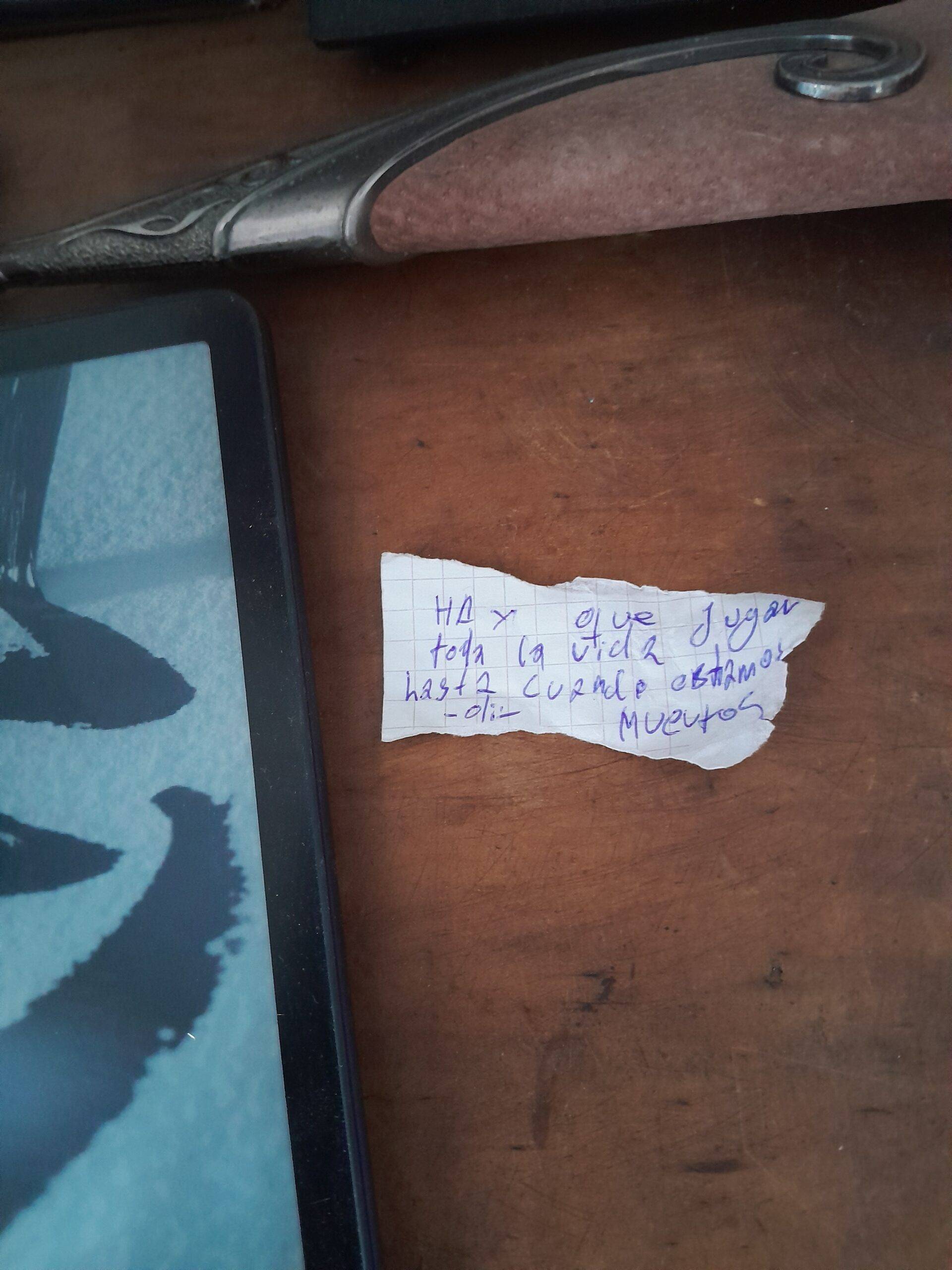Y acá vuelvo a esos signos misteriosos que siempre busco, porque sé que tarde o temprano se manifiestan. Este miércoles fui a buscar al más pequeño a la salida de inglés. Mientras volvíamos, me contó que durante la clase, derivada de la conversación que sostenían profesora y compañeros, se le ocurrió decir una frase. Y que uno de los pibes replicó que él, Oli, era un filósofo. Ese mismo pibe escribió la frase en un papelito que le dio a Oli y Oli me la regaló, un recortecito que dice: "Hay que jugar toda la vida, hasta cuando estamos muertos". Ahí tienen. Oli lo dijo mejor que yo. Y Cave estaría de acuerdo, mil por mil.