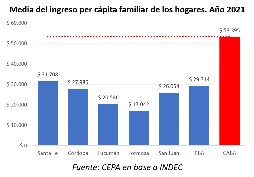 - Media del ingreso per cápita familiar de los hogares: el monto de CABA (53.395 pesos en valores del 2021) triplica el nivel de ingresos de Formosa y duplica el promedio simple de las jurisdicciones seleccionadas sin CABA (25.442 pesos).