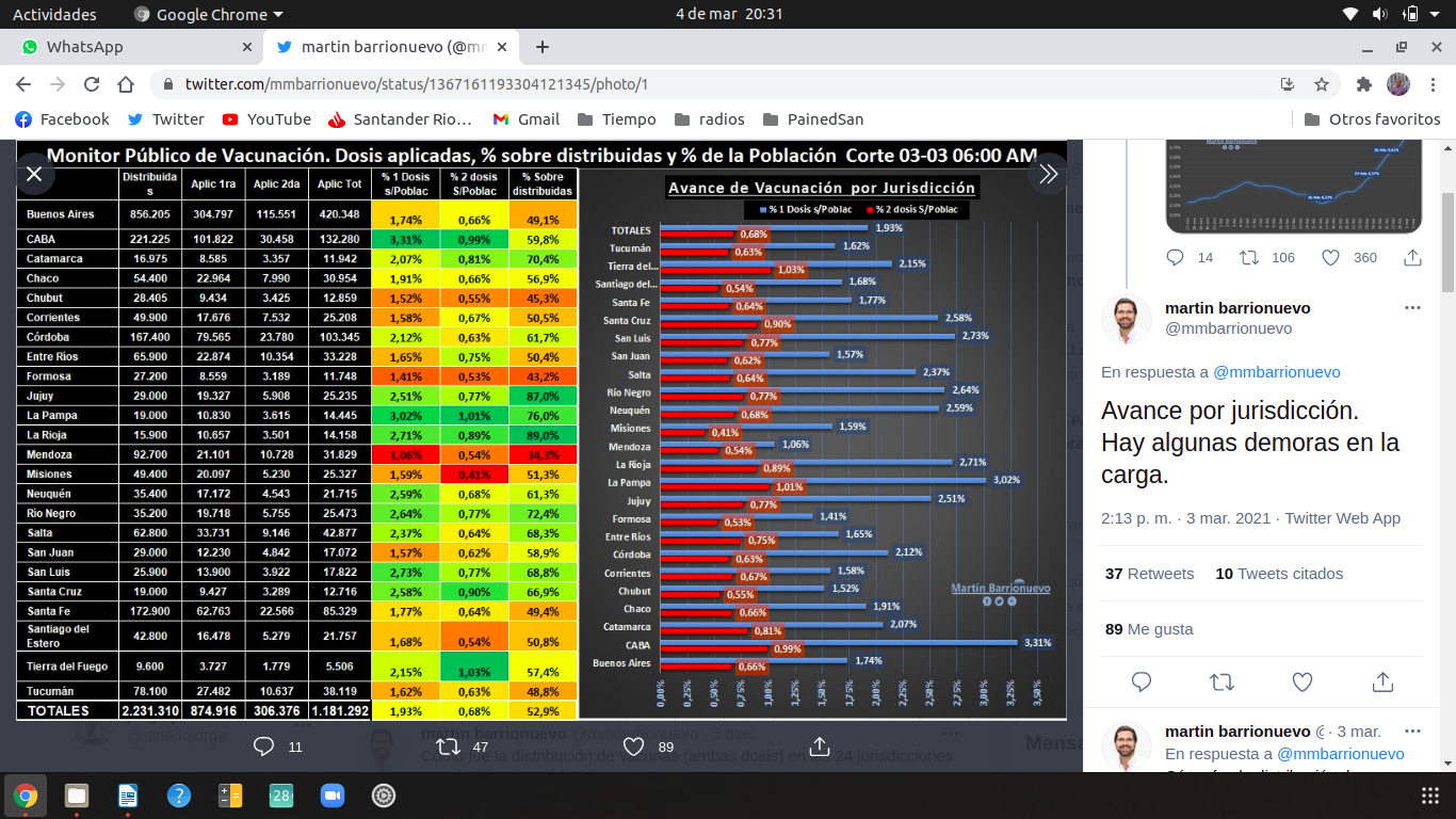 El cuadro confeccionado por el senador correntino Martín Barrionuevo refleja la proporción entre las dosis aplicadas y la población.