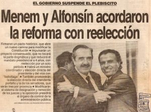 - El Pacto de Olivos- Con la reforma constitucional acordada en el Pacto de Olivos de 1993, Menem logró la habilitación de una nueva candidatura al concluir el mandato único para el que había sido electo, y Alfonsín aseguró la supervivencia de la UCR, con el tercer senador por provincia. También se ganó un lugar en la mejor historia nacional con la constitucionalización de los tratados internacionales de derechos humanos. Fue la más equilibrada de esa serie de transacciones, por más que Alfonsín desilusionara a quienes creían posible organizar un frente opositor que acabara con el ruinoso experimento neoliberal.