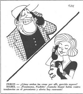 - Mover la Dama- El mismo sentido tuvo en 1966 el viaje a la Argentina de Isabel Martínez, para incidir en las elecciones provinciales de Mendoza, donde Augusto Vandor impulsaba un peronismo sin Perón. La candidatura peronista de Ernesto Corvalán Nanclares permitió que los demócratas conservadores ganaran la elección provincial, pero liquidó el proyecto vandorista encarnado por Alberto Serú García. Apenas dos meses después un nuevo golpe derrocó al gobierno radical de Arturo Illia, para impedir una victoria nacional del peronismo en las próximas elecciones presidenciales.