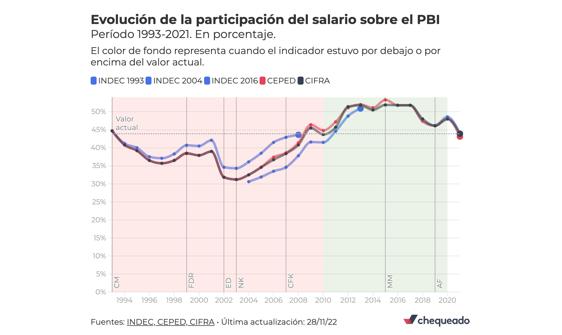 El odio tenaz que genera el peronismo en general (hoy circunstancialmente kirchnerismo) y CFK en particular en nuestro establishment nada tiene que ver con supuestas formas rudas, como lo podemos constatar hoy con el apoyo que consigue Javier Milei entre ese mismo establishment, pese a ser un Presidente explícitamente violento y autoritario. El odio es el mismo que generó Juan D. Perón y tiene que ver, en términos generales, con la puja distributiva. Un gráfico sobre la evolución de la participación del salario sobre el PBI entre 1993-2021 (publicado por Chequeado, con datos del INDEC, CEPED y CIFRA) puede ayudar a ilustrar este punto.