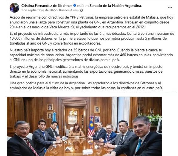 En septiembre de 2022, Cristina Fernández de Kirchner, reunida con directivos de YPF y Petronas, celebraba la idea de que el proyecto Argentina GNL modificaría la matriz energética de nuestro país. Decía que la propuesta tendría “impacto directo en la economía nacional, aumentando las exportaciones, generando divisas, puestos de trabajo y el desarrollo de nuevas industrias”. Todo eso quedó en el camino, primero con un anuncio de cambio de locación y luego con la confesión de que no habrá planta, sino unidades flotantes de almacenamiento y regasificación para ese fin.