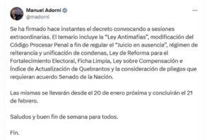 El decreto de convocatoria recién se conocería mañana, pero según el vocero Adormi también incluiría la eliminación de las PASO, la ficha limpia, la denominada Ley Antimafia, el juicio en ausencia, la reiterancia. Esta diversidad de proyectos, que interesan cada uno a una fuerza distinta, sugiere que el jefe de gabinete Guillermo Francos negoció con cada una de ellas en su búsqueda de quórum. Se verá con qué resultado.