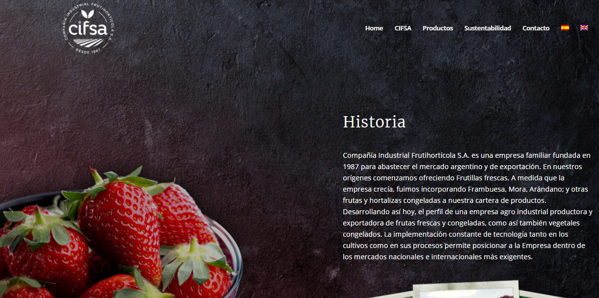 “Compañía Industrial Frutihortícola S.A. es una empresa familiar fundada en 1987 para abastecer el mercado argentino y de exportación. En nuestros orígenes comenzamos ofreciendo frutillas frescas. A medida que la empresa crecía, fuimos incorporando frambuesa, mora, arándano; y otras frutas y hortalizas congeladas a nuestra cartera de productos”, cuenta la empresa en su página. Así han desarrollado “una empresa agro industrial productora y exportadora de frutas frescas y congeladas, como así también vegetales congelados. La implementación constante de tecnología tanto en los cultivos como en sus procesos permite posicionar a la empresa dentro de los mercados nacionales e internacionales más exigentes”.