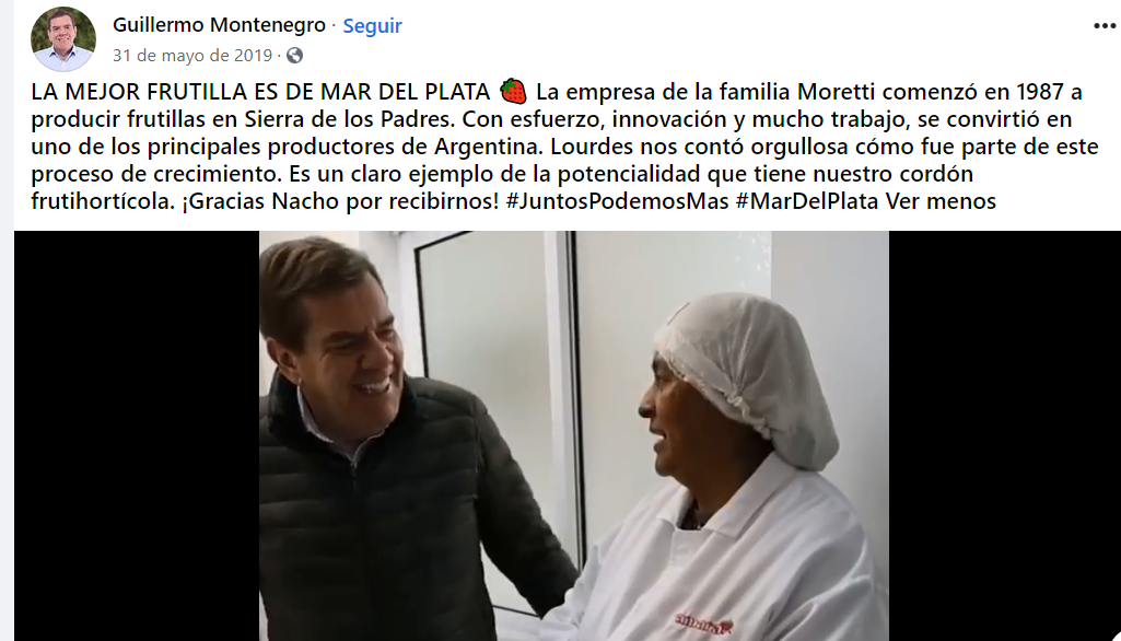 El ex juez federal que en 2007 renunció a su cargo para acompañar a Mauicio Macri como ministro de Justicia y Seguridad porteño y que en 2019 asumió como intendente de General Pueyrredón, parece haber estado poco informado de la investigación judicial por trata de personas con explotación laboral en los campos de Moretti. El 31 de mayo de 2019 difundió y promocionó en su cuenta de Facebook que “la mejor frutilla es la de Mar del Plata”. “La empresa de la familia Moretti comenzó en 1987 a producir frutillas en Sierra de los Padres. Con esfuerzo, innovación y mucho trabajo, se convirtió en uno de los principales productores de Argentina”, escribió como introducción al video para promocionar a la firma.