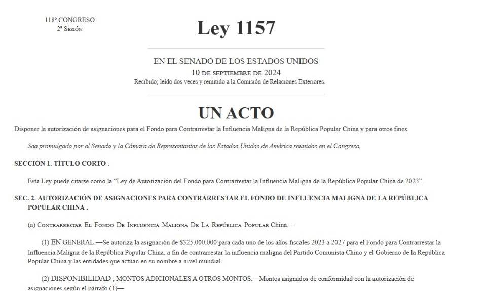 Hace justo un año comentamos en El Cohete la legislación de Estados Unidos que autorizaba la creación de un “Fondo para Contrarrestar la Influencia Maligna de la República Popular China”, con 325 millones de dólares anuales para los años fiscales 2023 a 2027, y para combatir “la influencia global del Partido Comunista Chino”. Decíamos también que era una cifra impactante: 1.600 millones de dólares en todo el ciclo para aceitar una cadena con un abanico de acciones contra China, con lobby, medios, ONGs, influencias, etcétera. En un solo año, ese monto duplica el presupuesto actual de la cadena de televisión por cable CNN. La ley, con voto muy mayoritario tanto de republicanos como demócratas, avanzó. Y daría la sensación de que esas mieles se derraman rápido entre ciertos medios latinoamericanos.