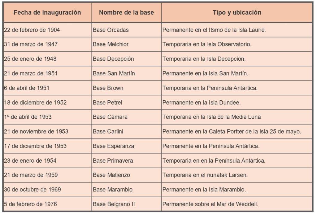 El próximo 22 de febrero del corriente año se conmemorará el 122º aniversario de la presencia permanente de la República Argentina en el continente antártico a partir de la apertura de la base en las Islas Orcadas. Dicha presencia se amplió a partir del primero y segundo gobiernos de Juan Domingo Perón (1946-1955), como muestra el siguiente cuadro.