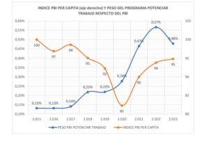 Macri redujo en 8 puntos el PIB per cápita y aumentó en un 50% el peso de los programas respecto del PIB; y luego del interregno de la pandemia, se recuperó en parte el PIB per cápita, pero también creció el peso de los planes.