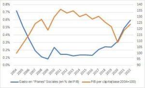 - el gasto en planes sociales se desplomó como participación en el producto, a medida que crecía el PIB per cápita, desde 2004 hasta 2009.
