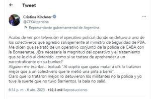Cristina, quien según Berni fue la primera persona que lo llamó para interesarse por su salud, tuiteó desde Río Gallegos: