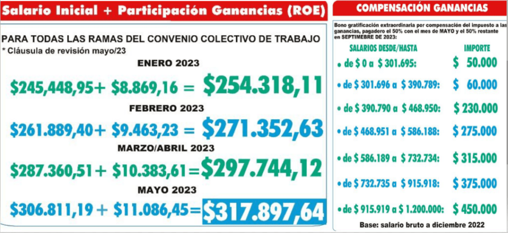 Desde mayo, el salario inicial de un trabajador bancario será de 317.897 pesos. “Fue una negociación complicada, por la variedad de temas y la tecnicidad de muchos de ellos, que tuvo una resolución favorable hacia los trabajadores”, expresa Palazzo. La compensación para que se reconozca el impacto del impuesto a las Ganancias, “va de 50.000 a 150.000 pesos, de acuerdo al rango salarial”, explica, y agrega que a partir del “acuerdo previsto para este primer semestre, el bancario percibe 24,1% a partir de marzo. Esto está por encima de la inflación proyectada. En mayo se agrega lo que falta para llegar al 32,1%. En los demás meses no se ha perdido”, destaca. Además, “en la segunda quincena de mayo tenemos la posibilidad de revisión, por si vemos que la inflación de junio va a exceder el acuerdo”, remarca.