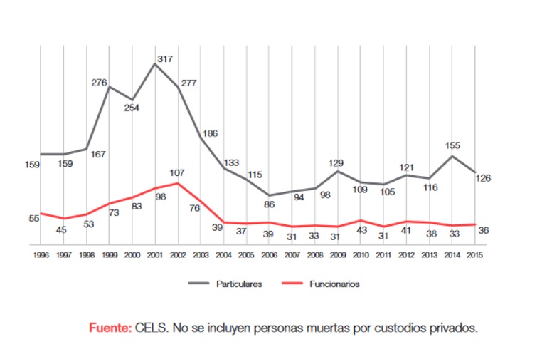 Tomemos ahora el informe de 2016 confeccionado por el CELS para mirar la violencia letal en las últimas dos décadas. Allí se puede ver que “la cantidad de personas muertas en hechos de violencia con participación de funcionarios de fuerza de seguridad en el Área Metropolitana de Buenos Aires” es inferior a las personas muertas en manos de particulares. También se puede constatar que la cifra de muertes de la década de los '90 es muy superior a la de la última década. En el 2002 hubo un pico de 107 casos pero a partir del 2004 la cifra desciende para amesetarse por debajo de las cifras de la década anterior. Persiste un núcleo duro de muertes que, está visto, el Estado no ha podido reducir, pero eso no quita reconocer que es inferior a las muertes protagonizadas por los particulares en la misma década.