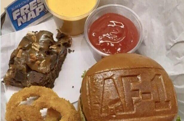 Gracias a un post de hace un tiempo de su colaborador Dan Scavino, pudimos dar un vistazo a la dieta de Trump en el aire; en la bandejita, típica de cualquier fast food del mundo, aparece una hamburguesa que, como sabemos, es un sándwich formado por un bloque de carne picada llamado patty y un pancito blando cortado por la mitad , pero este en particular lleva la marca a fuego AF-1, la sigla del Boeing 747-200 del Presidente.