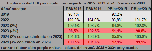 Si modificamos las proyecciones para 2024 y la tasa de crecimiento del 2 % se aplica sobre un escenario en el cual cae el nivel de actividad este año como la que anticipan el Banco Mundial y el FMI, el resultado es que se recupera el PBI de 2022, pero por el incremento de la población, el PBI per cápita se encontrará en niveles inferiores a los de 2022 e, incluso, a los de 2019.