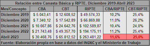 Como resultado, se redujo la presión de la CBA sobre el salario, si se mide la relación utilizando la RIPTE. Los datos correspondientes a febrero, que fueron los últimos que analizamos en El Cohete en la edición del 30 de abril, indicaban una relación CBA/RIPTE del 11,9 %, y de la Canasta Básica Total (CBT) con la RIPTE del 26,2 %. En abril se redujeron a 11,6 % y 25 %, respectivamente. Esto ubica a la presión de la CBT/RIPTE en valores más bajos que los de 2019, pero más altos que en los de 2021, el único año hasta ahora en el que se recuperó el salario real desde que gobierna el Frente de Todos. Mientras que la relación CBA/RIPTE sigue en su nivel más alto desde 2019.