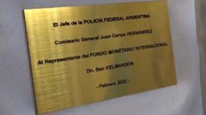 El jefe de la Policía Federal, comisario Juan Carlos Hernández, se deshizo en reverencias ante el nuevo delegado del FMI en la Argentina, el economista inglés Ben Kelmanson. Luego de una amable conversación, el policía argentino le entregó una plaqueta dorada.