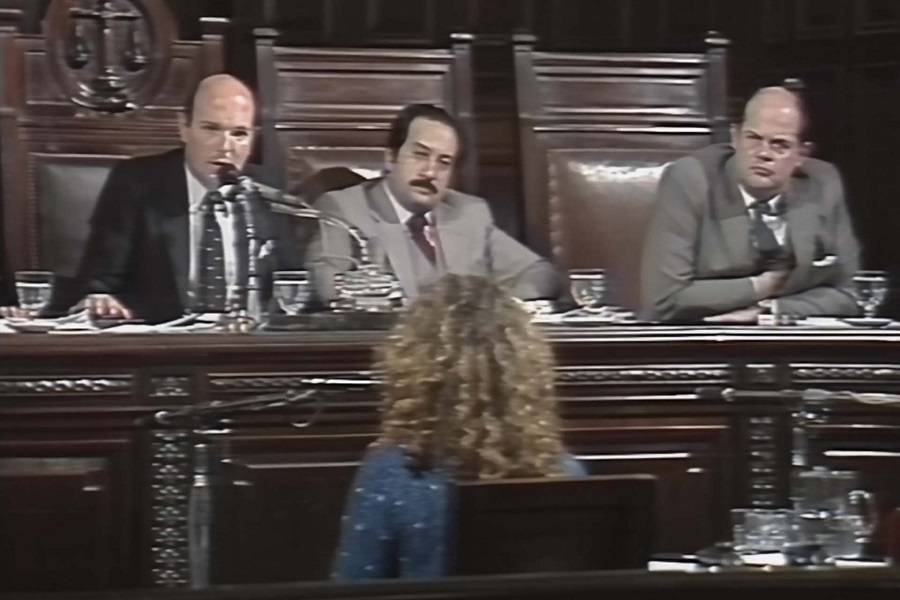 Con el elenco ya a la vista, El juicio despliega el drama con dominio ejemplar de los tiempos narrativos. Después de esa introducción hay un cuarto intermedio real pero también dramático, que muestra la entrada al tribunal del Almirante Rojas —uno de los responsables de la Revolución Fusiladora, símbolo de la impunidad del poder militar—, portando una sonrisa. En simultáneo los acusados hacen gala del mismo talante, cuchicheando con sus abogados y exhibiendo sonrisas que comunican hasta qué punto se sienten invulnerables, aun cuando están siendo juzgados. Hasta entonces el espectáculo ha sido masculino de modo excluyente: los jueces, los acusados, los abogados, los fiscales, el secretario — todos tipos. Una postal de la hombría que no nos deja bien parados, porque es pura sobreactuación de una dignidad que siempre está fuera de cuadro: la que la ley confiere a las autoridades judiciales, la divina que los milicos reivindican como propia, la que el privilegio material confiere a los defensores.