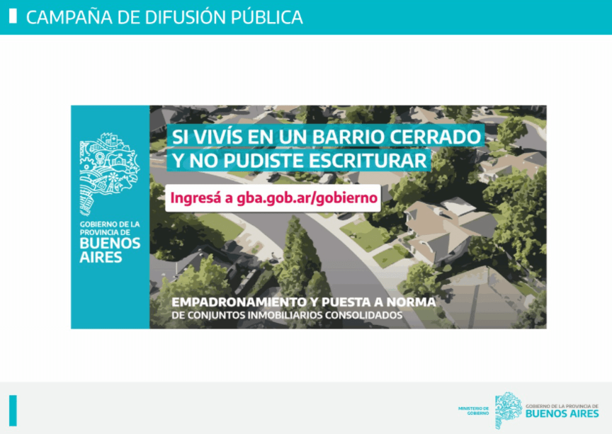 El trabajo de la Unidad consistió en la identificación de municipios con muchas urbanizaciones cerradas o nuevas urbanizaciones. Una vez identificadas, se dialogó con el intendente del distrito en cuestión, se realizó la reunión de técnicos del municipio con la provincia y se convocó a los desarrolladores. “Se les explica cómo es el proceso de puesta en norma y se comienza a trabajar”, expresa García, aclarando, “siempre y cuando exista voluntad del privado”.