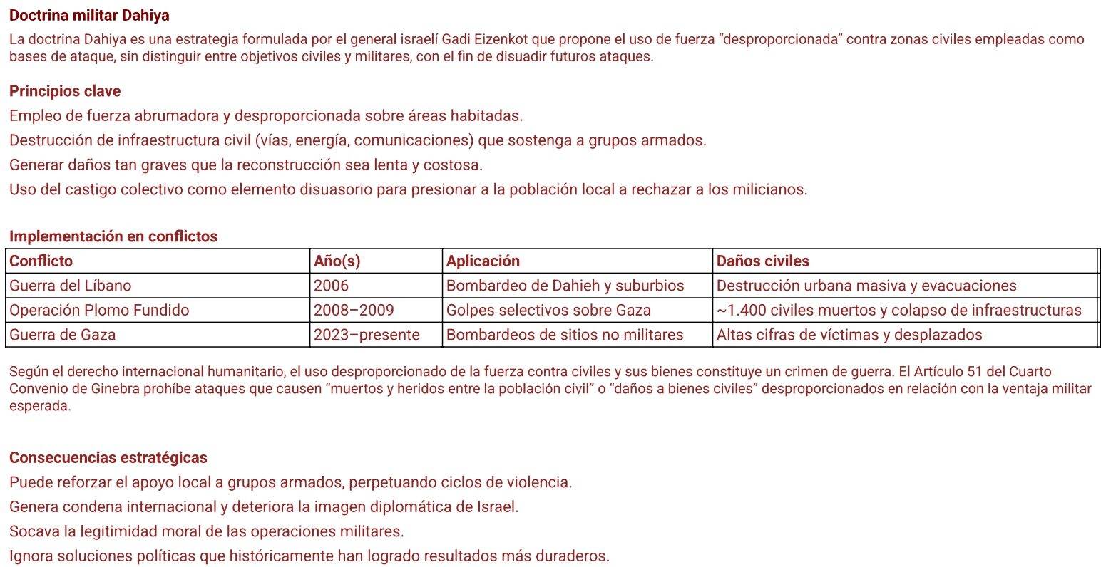 En cuanto al conflicto en sí, Israel recurre a su Doctrina Dahiya, bastante directa aunque extrema. Esta doctrina establece que, si una insurgencia no puede ser derrotada por medios militares directos, las Fuerzas de Defensa de Israel (FDI) emplearán una fuerza desproporcionada contra la población civil para ponerla en contra de los insurgentes. Es una táctica habitual de las FDI, empleada en el Líbano y en guerras anteriores en Gaza, pero la operación actual va mucho más allá, constituyendo la destrucción total de la sociedad palestina.