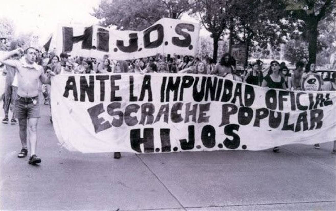 En la búsqueda de la memoria, la verdad y la justicia, los hijos e hijas de desaparecidos (también ellos víctimas del terrorismo de Estado, en su absoluta singularidad y pluralidad), y a partir de un conjunto de circunstancias casuales y no tanto, se reúnen en tiempo y espacio para socializar los dolores y las historias, pero también para sentirse menos solos frente a una sociedad que todavía les daba la espalda. La voz que de allí surge es también hija de todas las particularidades de la década del ‘90, donde el campo popular se enfrentaba a la herencia neoliberal del Proceso, al ajuste salvaje del nuevo Consenso de Washington, a la obturación de la demanda de “juicio y castigo a los culpables” a partir de las leyes de Punto final y Obediencia Debida del gobierno de Alfonsín y los posteriores indultos.