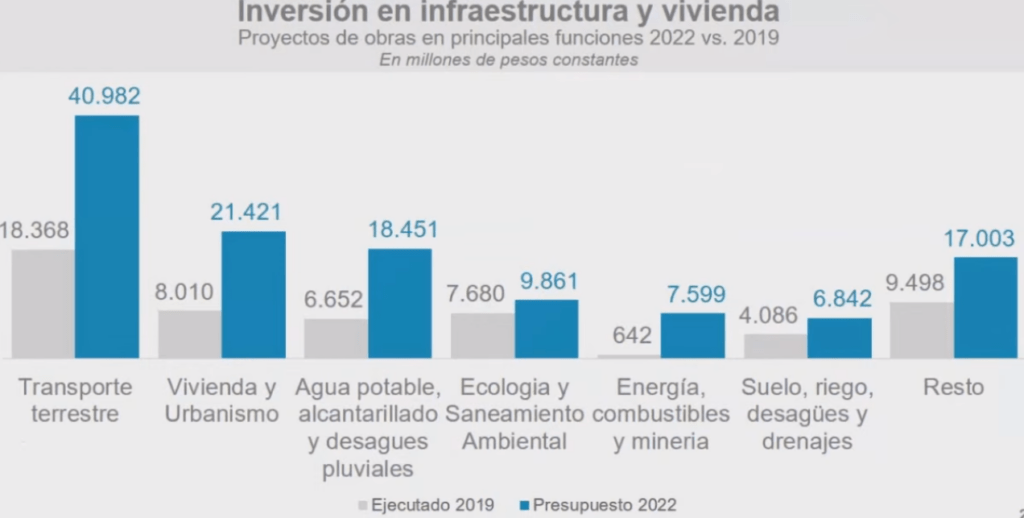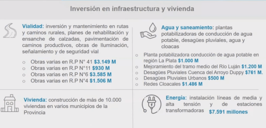 La inversión en infraestructura supera los 260.000 millones de pesos e implica un crecimiento real de 123% con respecto a 2019. Se incluyen inversiones en transporte terrestre por más de 40.000 millones de pesos; en vivienda, por más de 20.000 millones de pesos; en agua potable, alcantarillado y desagüe pluvial, por más de 18.000 millones. También se destinan 9.800 millones a ecología y saneamiento ambiental; 7.600 millones a energía, combustible y minería; y 6.800 millones a suelo, riego y desagües y drenajes. Otras inversiones clave en infraestructura  contemplan 17.000 millones de pesos. Se proyectan obras viales en las rutas 41, 11, 6 y  4, entre otras.