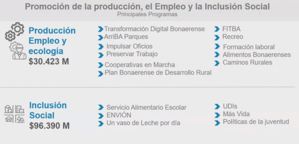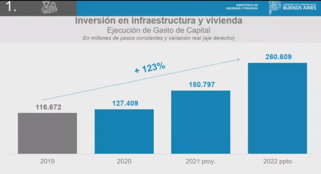 El gobierno de Axel Kicillof planea la construcción de 10.000 viviendas y en el rubro energía, la instalación de media y alta tensión y estaciones transformadoras con una inversión de más de 7.000 millones de pesos. En cuanto al eje de promoción del empleo e inclusión social, el ministro de Hacienda y Finanzas explicitó que hay un crecimiento en la inversión no salarial en las funciones productivas y en inclusión social. El presupuesto de más de 123.000 millones de pesos representa un crecimiento de 61% en términos reales con respecto a 2019.
