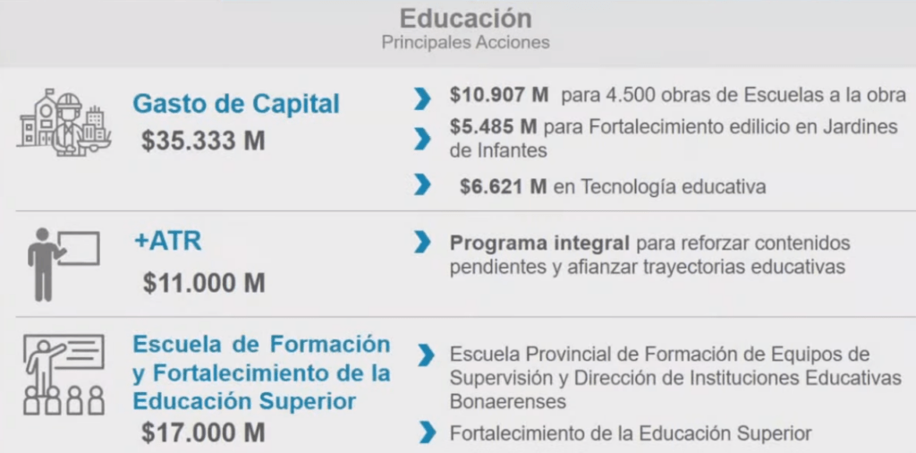 El gobierno bonaerense seguirá robusteciendo la infraestructura de las escuelas y proyecta la construcción de nuevos establecimientos, además de propiciar inversiones en tecnología que permitan mejorar la calidad educativa. Se prolongarán los programas de fortalecimiento de inicio de Jardines de Infantes y de Acompañamiento de Trayectorias y Revinculación escolar (ATR), que significó una fuerte inversión para quienes necesitaron de ese apoyo por la interrupción de las clases presenciales, producto de la pandemia. También, en 2022 se avanzará con la Escuela de Formación y Fortalecimiento a la Educación Superior.