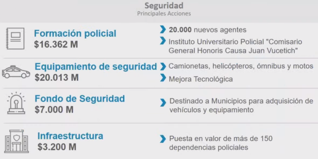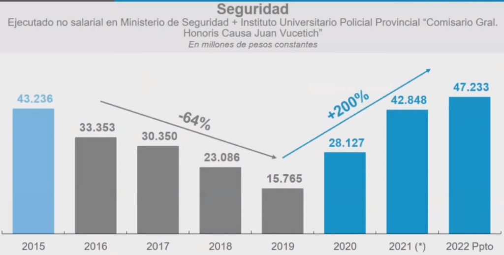 En materia de seguridad, para 2022 se contemplan inversiones en 47.000 millones de pesos, que  representa un crecimiento de más de del 200% en comparación con 2019.  Se incrementará la cantidad de agentes en 20.000 policías y se contempla la creación del Instituto Universitario Policial, ya anunciado por el gobernador. Más de 20.000 millones de pesos se destinan a equipamiento, como también se incluye un Fondo de Seguridad para fortalecer el equipamiento en coordinación con los municipios bonaerenses. También se proyecta la puesta en valor de más de 150 dependencias policiales con una inversión de más de 3.200 millones de pesos.