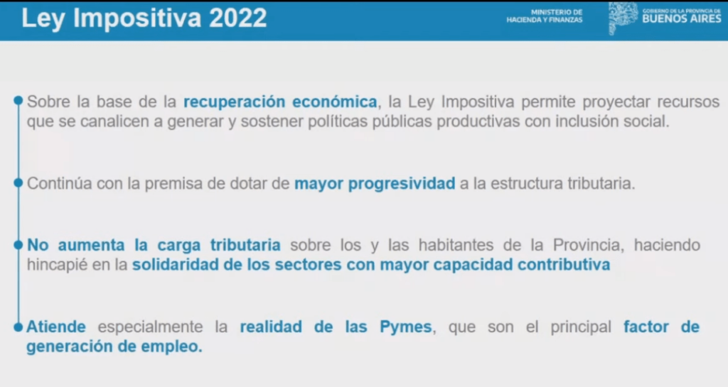 El ministro de Hacienda y Finanzas bonaerense, Pablo López, presentó el lunes los lineamientos generales de la ley impositiva y los ejes del Presupuesto 2022 en la Cámara de Diputados provincial. “Continuamos con la premisa de dotar de mayor progresividad a la estructura tributaria de la provincia de Buenos Aires y no aumentar la carga tributaria sobre los y las habitantes, haciendo hincapié en la solidaridad de los sectores que mayor capacidad contributiva tienen”, expresó. El Presupuesto del año próximo plantea un nivel de gastos totales de 3,1 billones de pesos con un resultado primario deficitario de 48.800 millones y un pedido de endeudamiento por 94.000 millones de pesos. Señaló seis ejes fundamentales de inversión: infraestructura y vivienda; promoción de la producción, el empleo y la inclusión social; educación; seguridad; salud y –por primera vez en un presupuesto bonaerense– perspectiva de género.