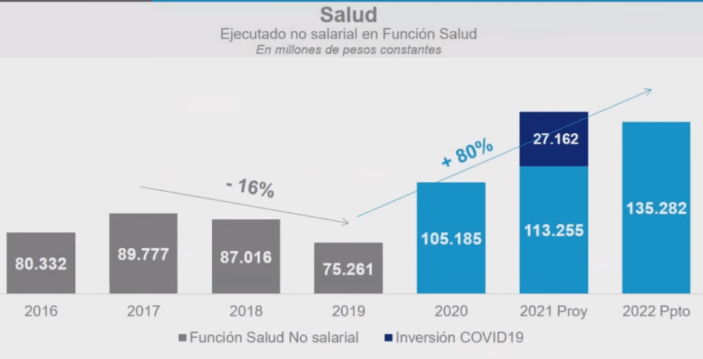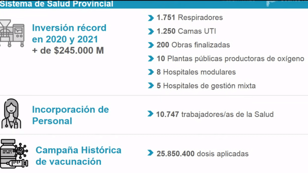 La reestructuración de la deuda lograda por Kicillof, junto con la recuperación de puntos de coparticipación, permitió contar con mayores recursos en 2020-2021 y realizar inversiones récord en el sistema de salud provincial, que hacia fines de 2019 estaba destruido. La provincia ha invertido más de 245.000 millones de pesos que se tradujeron en más de 1.700 respiradores,  más de 1.250 camas de terapia intensiva, 200 obras finalizadas, 10 plantas públicas productoras de oxígeno, 8 hospitales modulares, 5 hospitales de gestión mixta y 10.747 personas incorporadas en el sistema de salud, sumada una campaña de vacunación eficiente que avanzó en forma acelerada.
