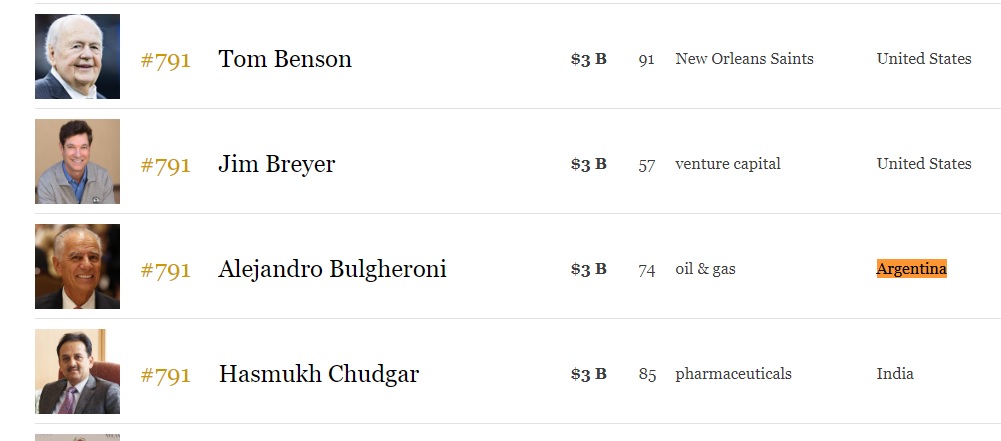 Así nos enteramos que los Rocca de Techint poseen activos por 9.700 millones de dólares, la familia Bulgheroni tiene 7.300 millones de dólares, la familia Pérez Companc 3.900 millones, siguen los Eurnekian, los Werthein, los Roemmers, los Bagó, los Madanes Quintanilla, los Braun, los Brito, los Urquía, los Esquenazi, los Noble Herrera, los Magnetto, etc. etc. Aquí la lista completa: https://www.forbes.com/billionaires/list/47/#version:static