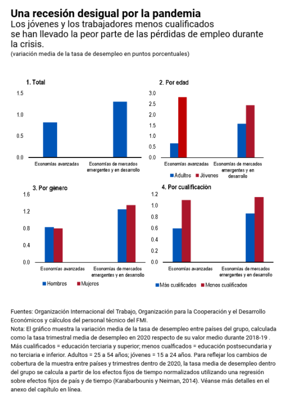 Los jóvenes y los trabajadores menos cualificados fueron, en promedio, los más afectados. Las mujeres, especialmente en las economías de mercados emergentes y en desarrollo, también sufrieron el impacto. Muchos de esos trabajadores enfrentan pérdidas de ingresos y dificultades a la hora de buscar oportunidades de empleo. Aun después de que la pandemia se atenúe, los cambios estructurales de la economía a raíz del shock pueden significar que las opciones de empleo en ciertos sectores y ocupaciones se contraigan permanentemente y que aumenten en otros.