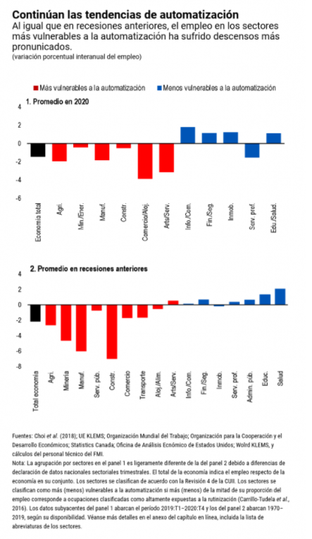 Los empleos que requieren un menor nivel de aptitudes y competencias y son más vulnerables a la automatización tendieron a sufrir más durante la recesión provocada por la pandemia. Aunque los impactos en determinados sectores fueron distintos de los registrados en recesiones anteriores, la pandemia ha acelerado tendencias preexistentes, reforzando una declinación del empleo en sectores y ocupaciones más vulnerables a la automatización.