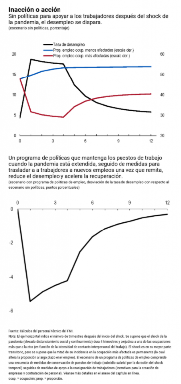 En nuestro último informe Perspectivas de la economía mundial analizamos cómo las políticas pueden atenuar los efectos severos y desiguales de la pandemia. Observamos que un programa de medidas destinadas a ayudar a los trabajadores a conservar su empleo mientras el shock pandémico está en curso, combinado con medidas que alienten la creación de puestos de trabajo y faciliten el ajuste a nuevos empleos y ocupaciones al menguar la pandemia, puede amortiguar considerablemente el impacto negativo y mejorar la recuperación del mercado de trabajo.
