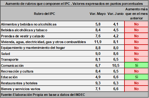 El menor incremento se explica, principalmente, porque el rubro más influyente en el nivel general, alimentos y bebidas, aumentó un 4,1 %, mientras que en mayo había aumentado un 5,8 %. Con la excepción de bebidas alcohólicas y tabaco, y prendas de vestir y calzado, la mayor parte de los rubros tuvieron incrementos superiores al del nivel general.