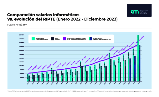 El informe del OTI expone que el crecimiento del mundo empresario argentino no se corresponde con los salarios que paga. Para corroborarlo, establece una comparativa de los promedios salariales del sector con el índice RIPTE, que mide la remuneración sujeta a aportes de trabajadores y trabajadoras que se desempeñan en relación de dependencia y han sido declarados sostenidamente en los trece meses previos a su cálculo.