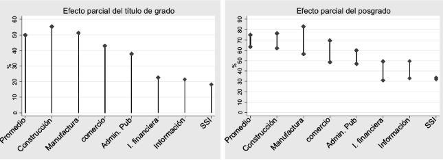 Los índices salariales muestran, además, que el capital prefiere formar en su propia práctica a su personal y no recompensa la posesión de títulos universitarios. Es evidente cuando se lo compara con el efecto que los grados o posgrados tienen en los salarios de otros rubros. Como explican Andrés Rabosto y Mariano Zukerfeld, no parece ser una característica de esta industria sino del país: en Estados Unidos, los títulos de grado incrementan en alrededor de un 60% los salarios, frente al 45% que promedia la economía norteamericana y al 18% en que lo hace el sector de servicios informáticos en Argentina. Rabosto y Zukerfeld lo volcaron a un gráfico elocuente.