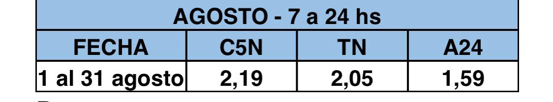 Para no abrumarlos con tanto preámbulo, empiezo a largar datos. Durante agosto, el promedio oficial de ráting de TN —el canal de noticias más visto, entre los opositores— fue de poco más de dos puntos: 2,05. Lo cual equivale formalmente a 184.500 personas, a partir de la convención de que cada punto de ráting sería equivalente a 90.000 personas. (Y estoy siendo generoso. Se supone que el máximo de audiencia por punto es de 96.782 personas, habitualmente el target medio es de 75.000.) Sumémosle el promedio de A24, que dio 1,59: 143.000 personas. Hay más canales opositores, en cifras siempre descendientes. Por supuesto, estos televidentes no son exclusivos por definición: la lógica indica que existe zapping entre canales del mismo tenor, por lo cual aquel que aparece a las 19 en el casillero de TN también puede estar sumando a las 22 en el casillero de A24. Pero, para concederles el beneficio de la duda, hagamos de cuenta de que cada televidente es exclusivo de cada señal. Aun así, las cifras distan de ser impresionantes.