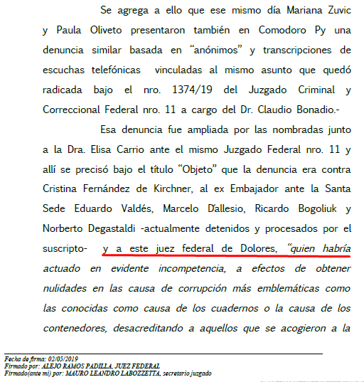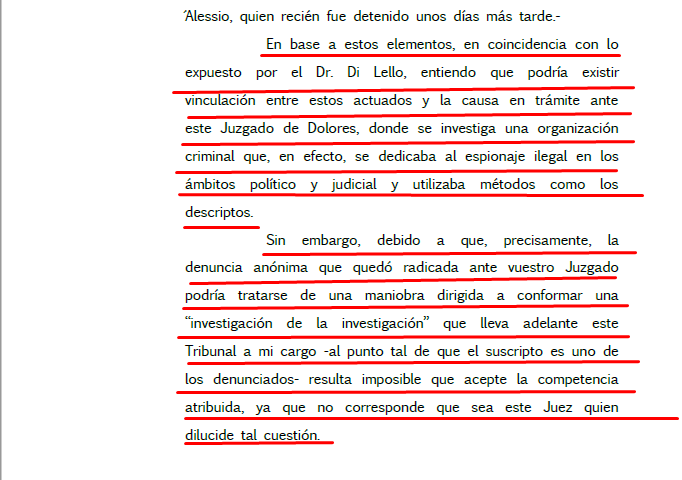 Una denuncia similar a la que hicieron Zuvic y Oliveto fue sorteada y recayó en el juzgado de Luis Rodriguez, quien se declaró incompetente y se la envió al juez de Dolores. ¿Y qué hizo el juez de Dolores? La rechazó, por la sencilla razón de que no puede investigar esa causa, pues aparece en ella.