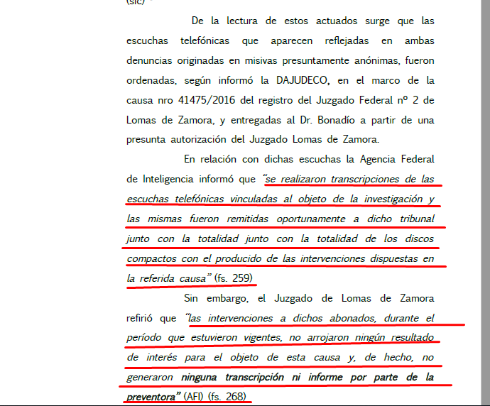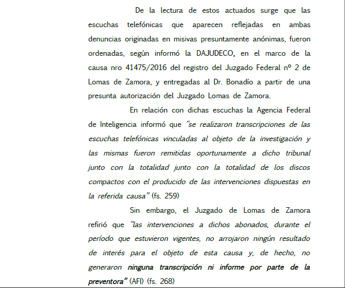 La denuncia en cuestión curiosamente cayó en el juzgado de Bonadío. Quien aparece mencionado en las escuchas. Razón por la cual debió apartarse de inmediato. Porque no se puede ser juez y parte. Y si Bonadío esta mencionado en las escuchas, es claro que Bonadío no puede investigar esas escuchas.