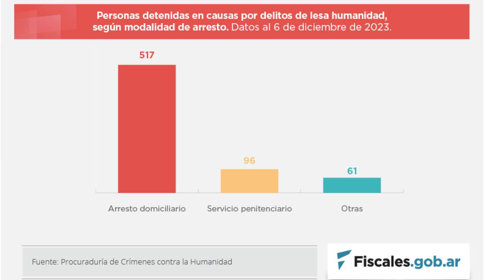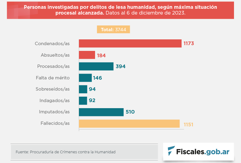 Hasta la asunción de Javier Milei, el 10 de diciembre de 2023, en los juicios por delitos de lesa humanidad que se reabrieron en el 30º aniversario del golpe de Estado, en 2006, se había condenado a 1.173 personas, según la Procuraduría de Crímenes contra la Humanidad.