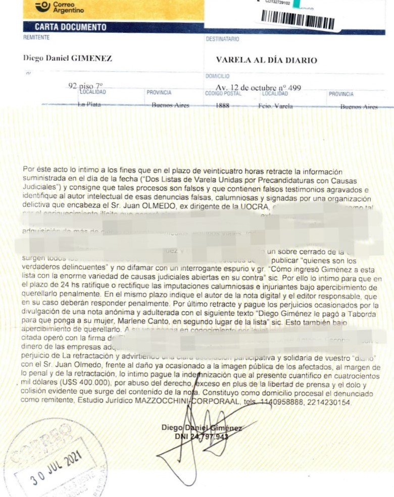 A pesar de la precisión informativa, las intimaciones redactadas por el estudio jurídico Mazzocchini-Corporaal de La Plata pretenden que “el autor de la nota digital y el editor responsable deberá responder penalmente. Por último, retracte y pague los perjuicios ocasionados por la divulgación de una nota anónima y adulterada”.